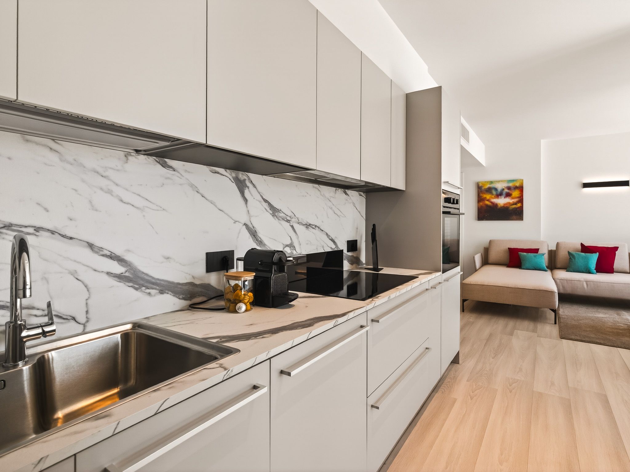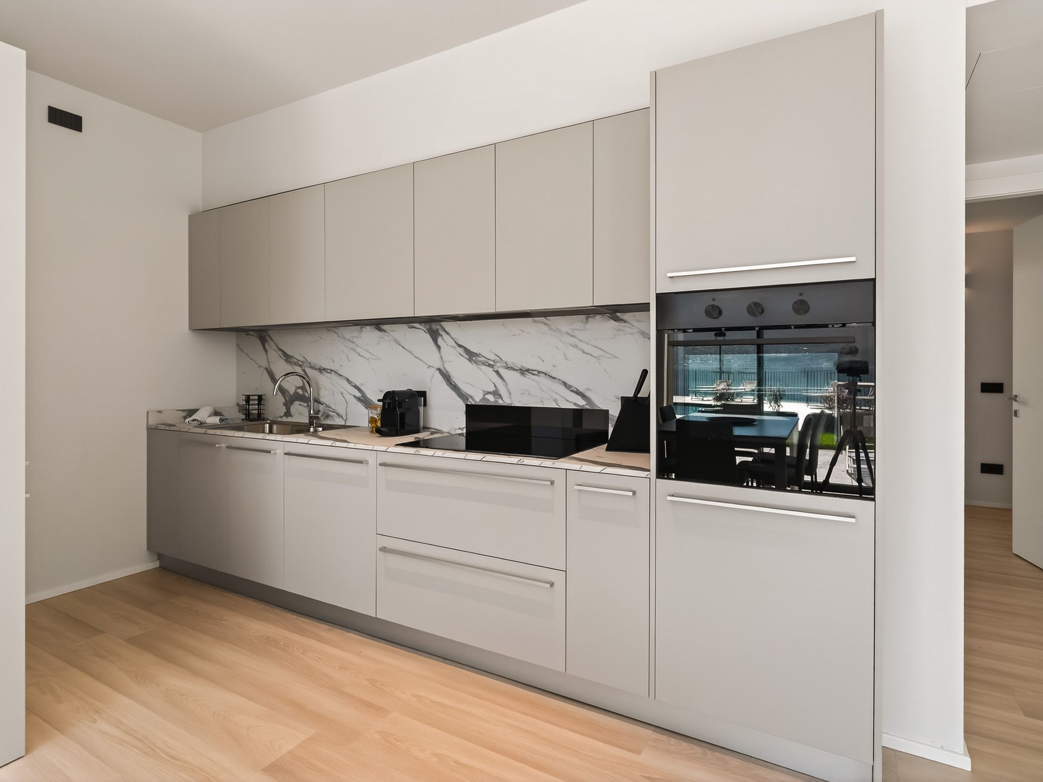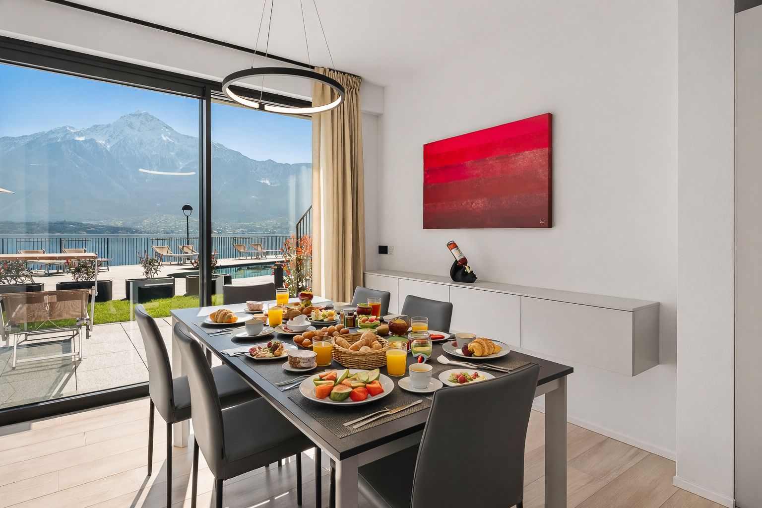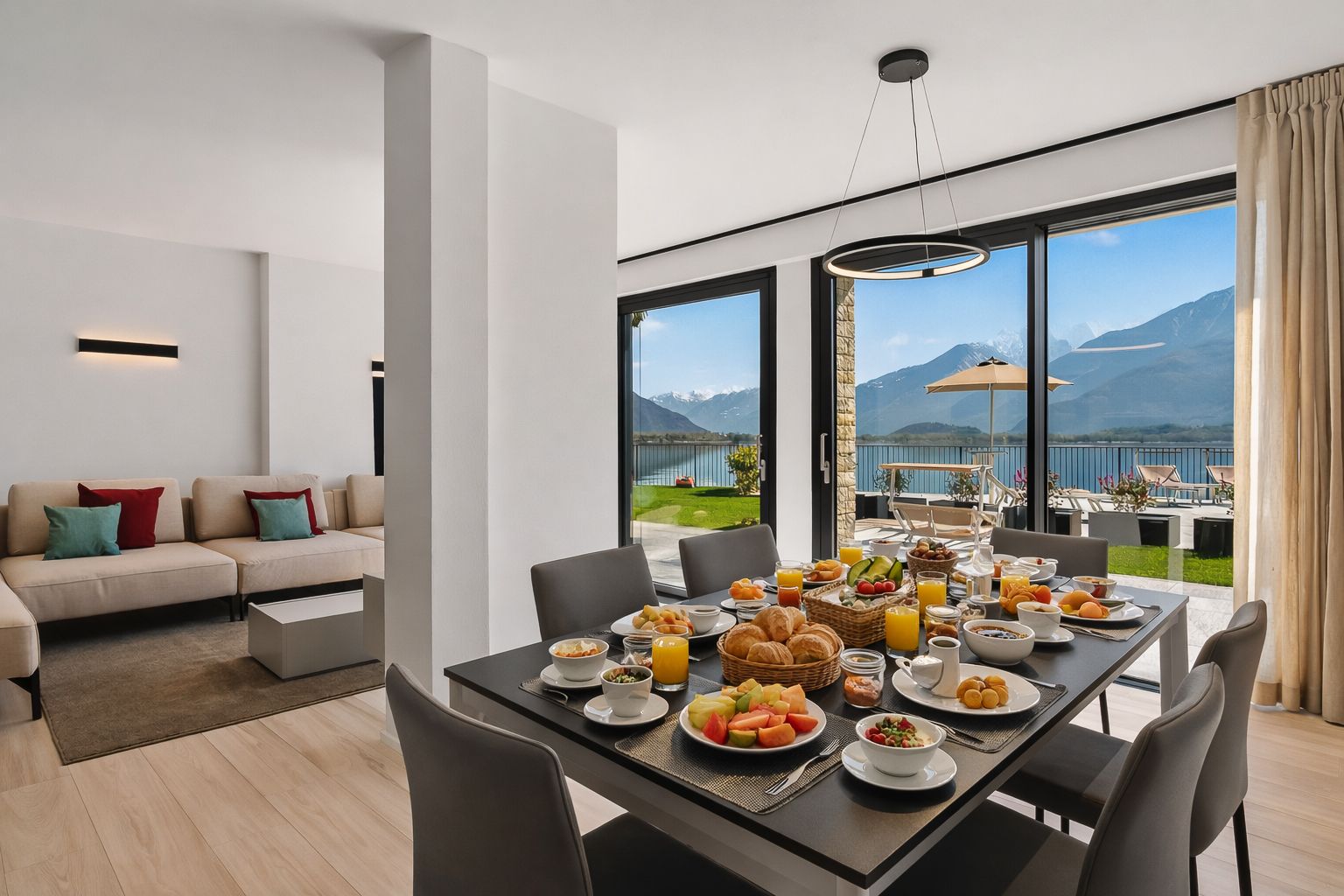 La zona giorno, arredata con stile, è dotata di un grande e comodo divano affacciato sul lago e di una Smart TV e invita al relax. La cucina a vista è armoniosamente integrata nella zona pranzo ed è dotata di un moderno bancone e di sgabelli da bar, ideali per serate conviviali in cui cucinare insieme.