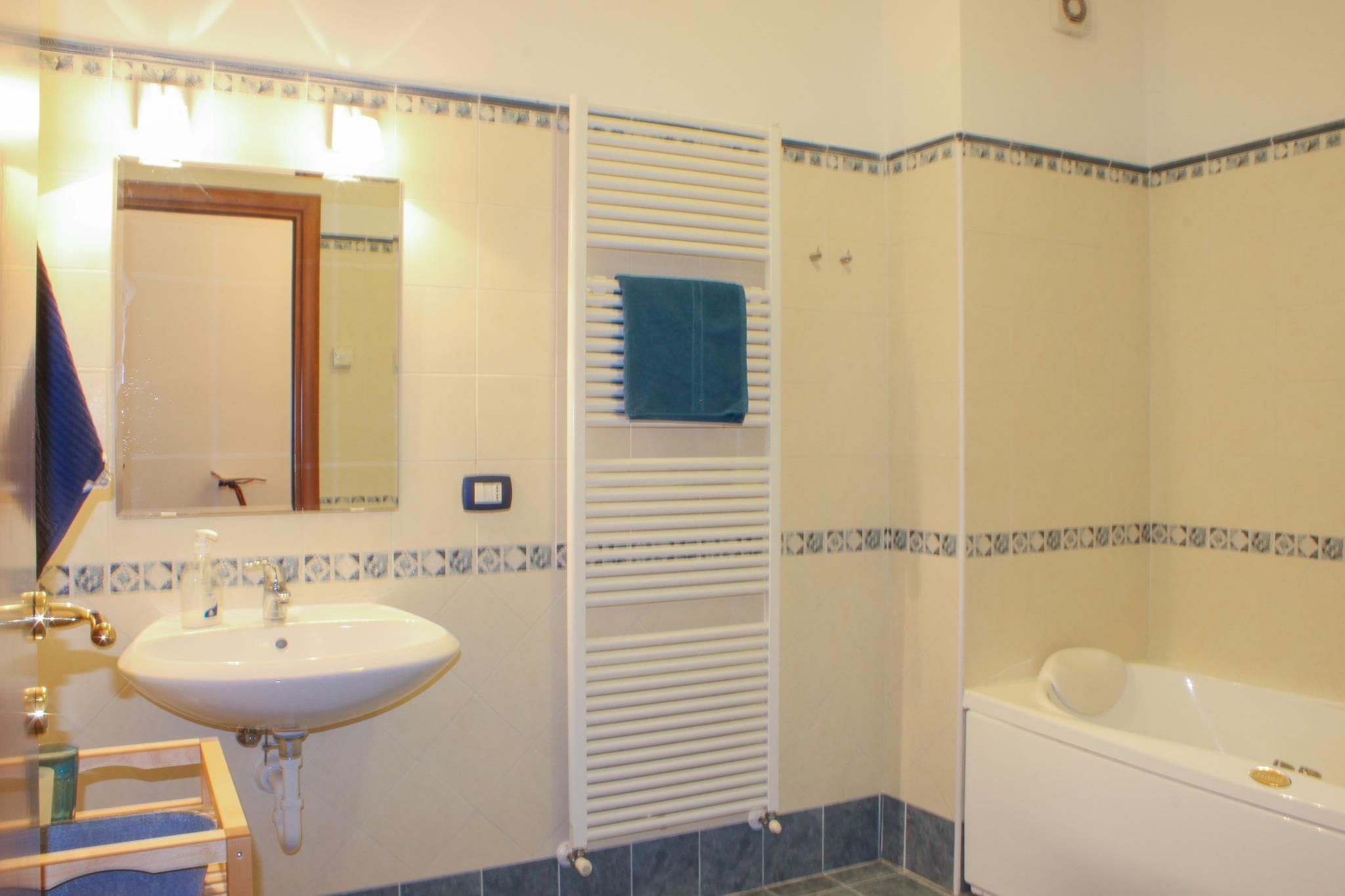 Nella dependance della nonna c'è un letto matrimoniale (160 cm) e un bagno con vasca e deumidificatore con aria condizionata integrata, con accesso al garage singolo e scala per la zona giorno.