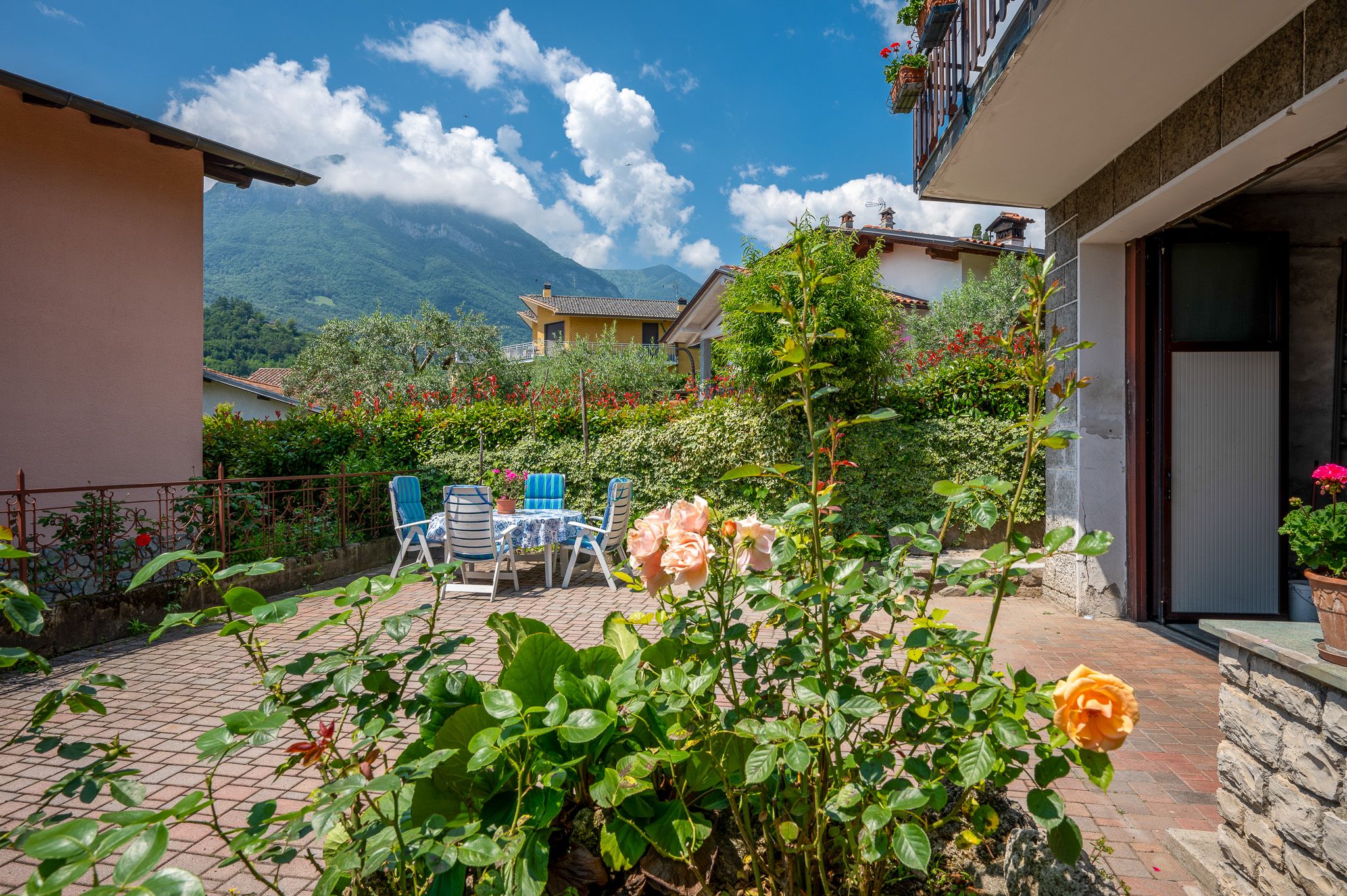 Un grande cancello vi conduce nel cortile pavimentato. La casa vacanze con ingresso e garage vi aspetta sulla destra.