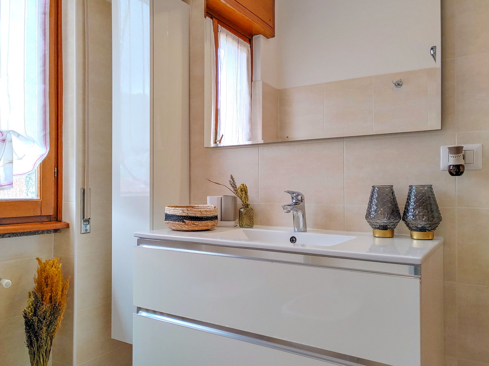 Al piano terra si trova una pratica lavanderia con lavatrice, asse da stiro e ferro da stiro. Inoltre, sono disponibili una doccia e un WC.