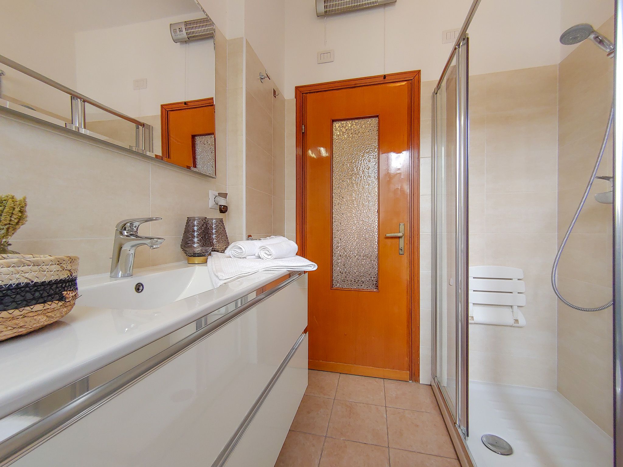Il bagno, con piastrelle luminose, è dotato di lavabo, doccia con sedile, WC e bidet.