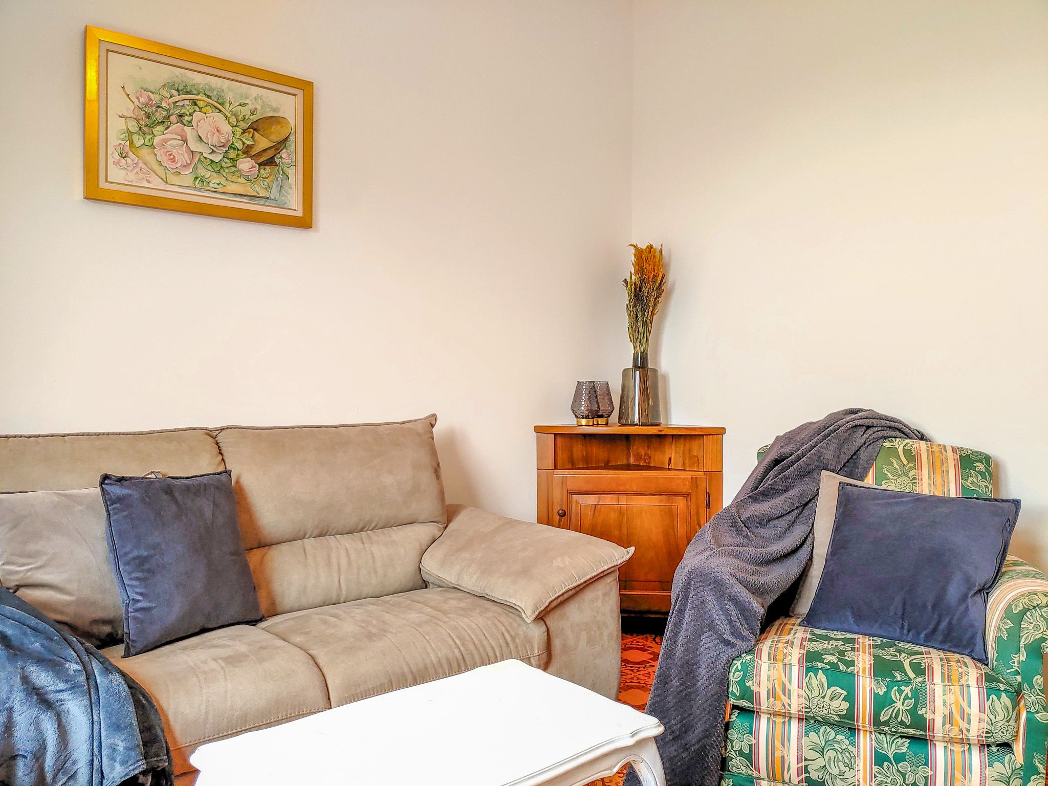Una scala conduce alla zona giorno superiore, dove si trova una piccola ma ben attrezzata cucina con tavolo da pranzo. Il soggiorno è arredato in stile italiano e invita al relax con un comodo divano, due poltrone e una TV. Sia dalla cucina che dal soggiorno si accede a un balcone, da cui si gode la vista sulle montagne e in parte anche sul lago. Un tavolino con sedie permette di godere della vista e di cenare all'aperto.