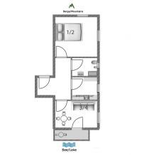 Il piccolo disimpegno conduce alle singole stanze: il soggiorno affacciato sul lago ha un tavolo da pranzo, un divano con letto matrimoniale e l'accesso al balcone.