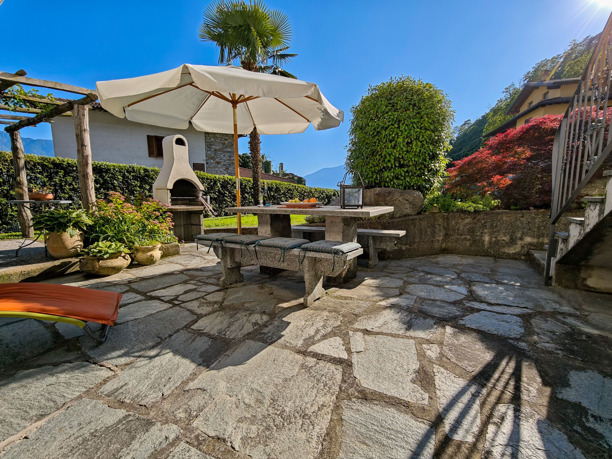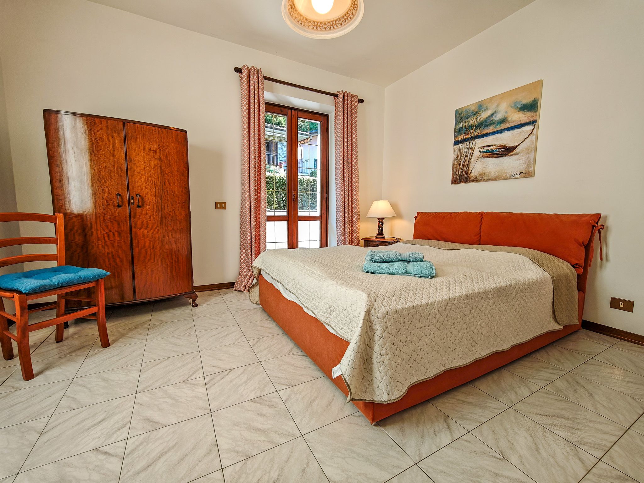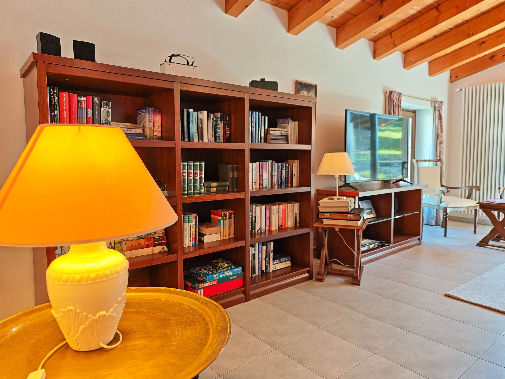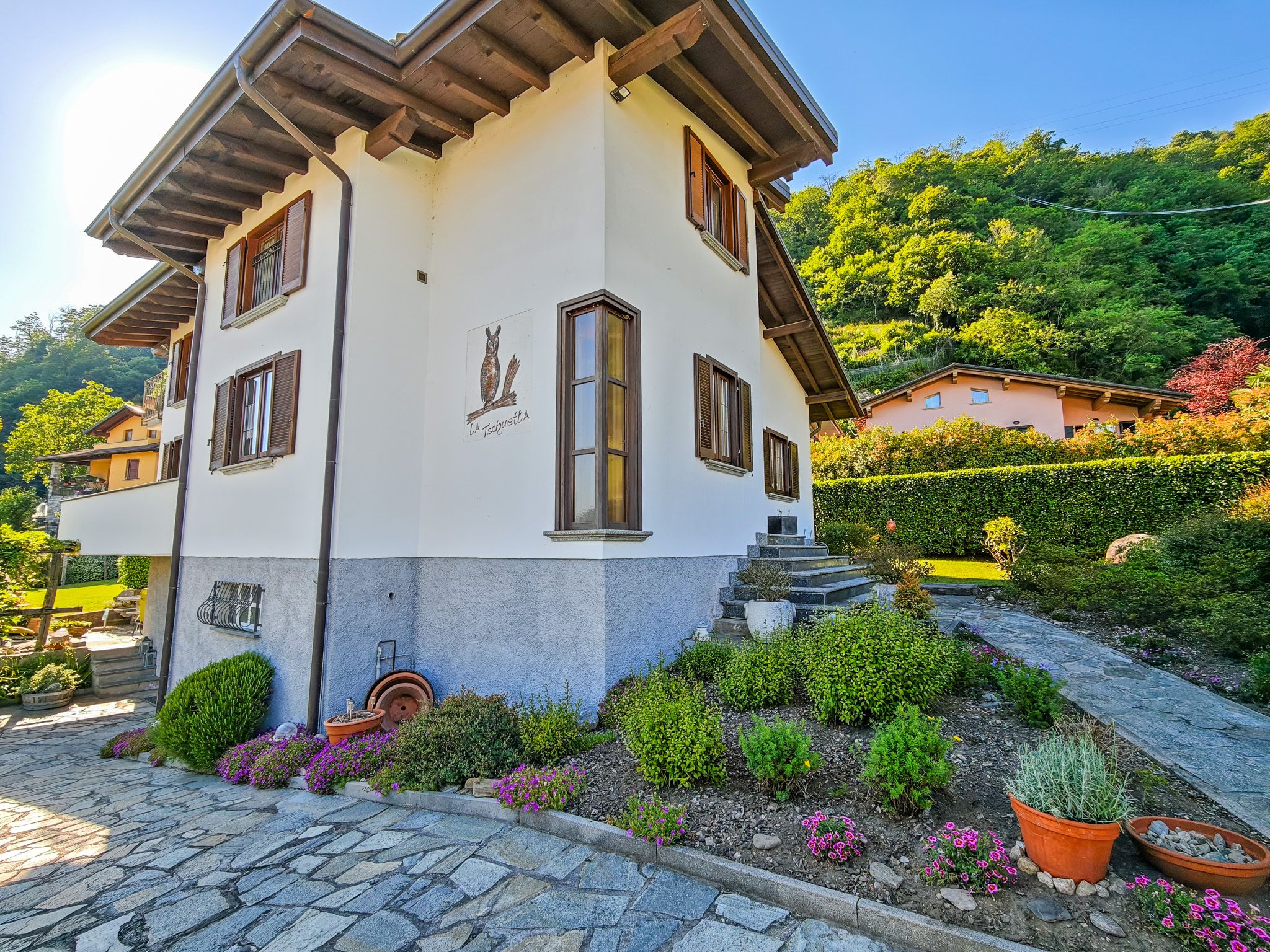 Al piano terra rialzato, il disimpegno conduce alla cucina-sala da pranzo ben attrezzata, con accesso al soggiorno, con zona salotto, camino e accesso al lungo balcone a L affacciato sul lago; le scale conducono al giardino.