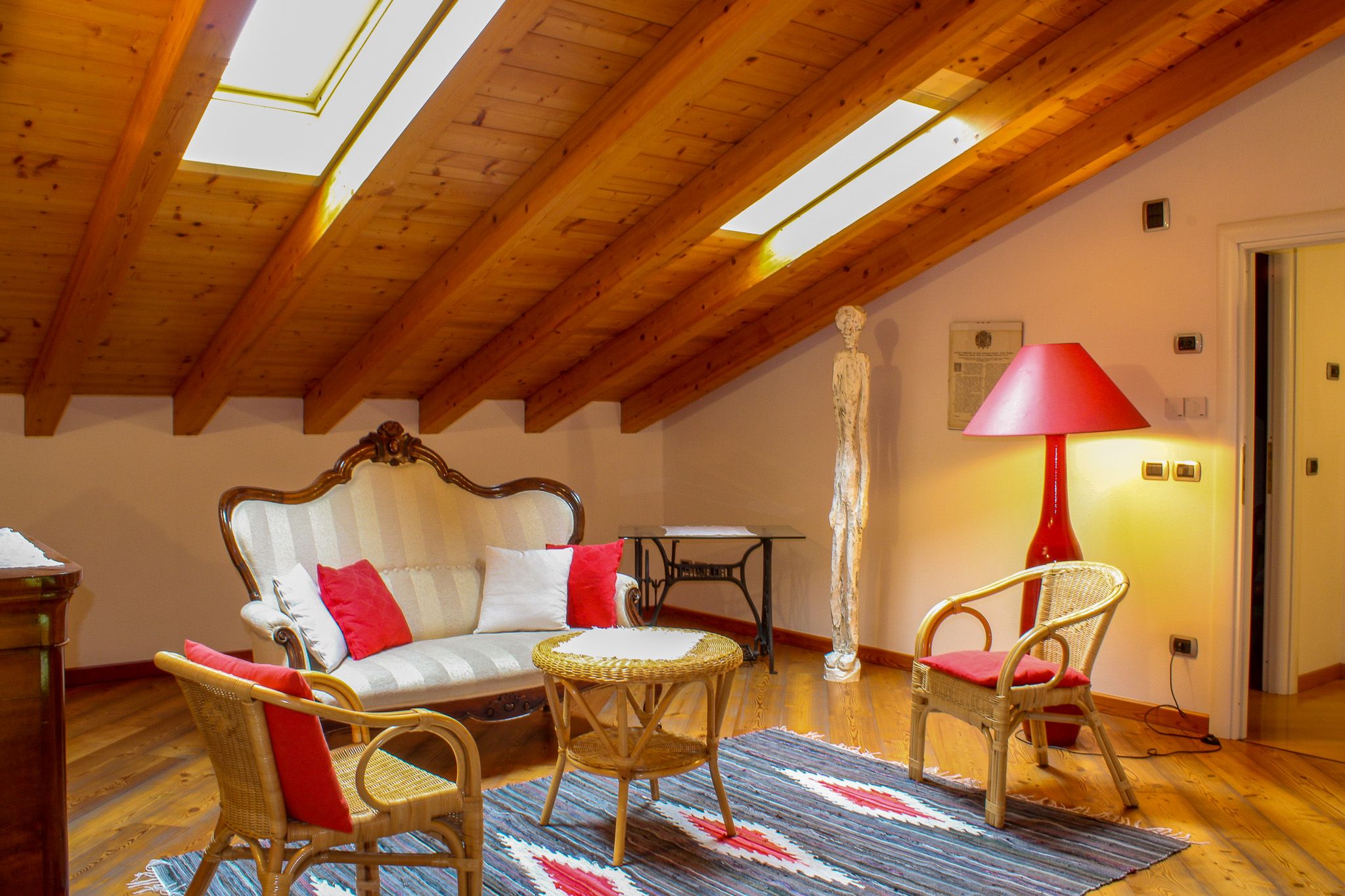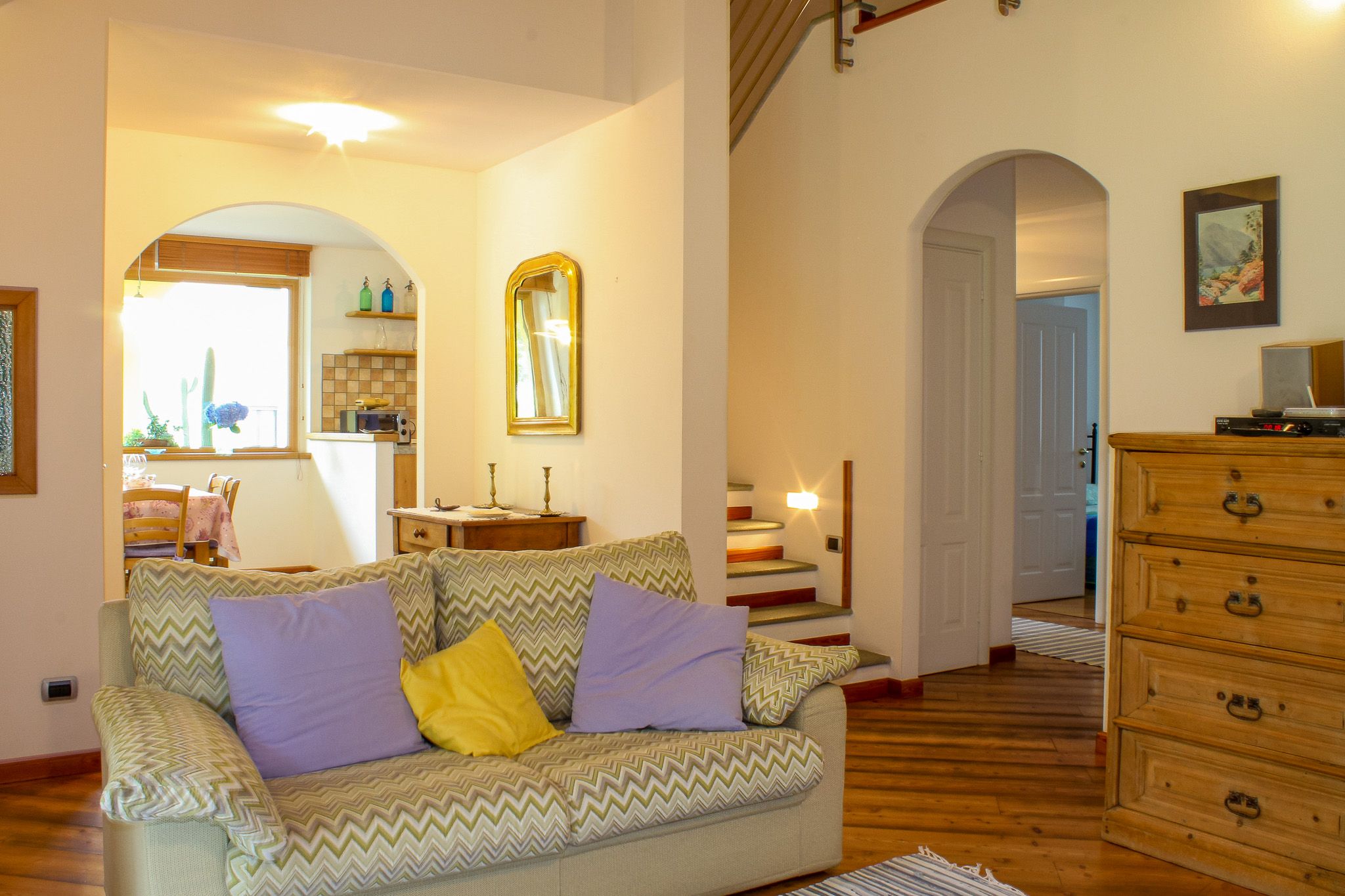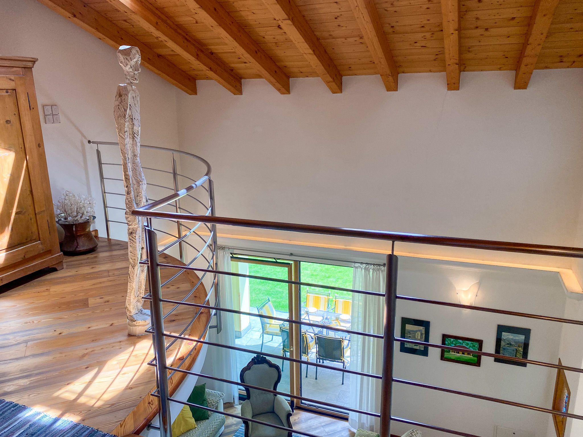 Dalla zona giorno, la scala in granito conduce al ballatoio superiore con la seconda zona giorno e notte dai soffitti spioventi. La scala in granito è protetta da un cancelletto.