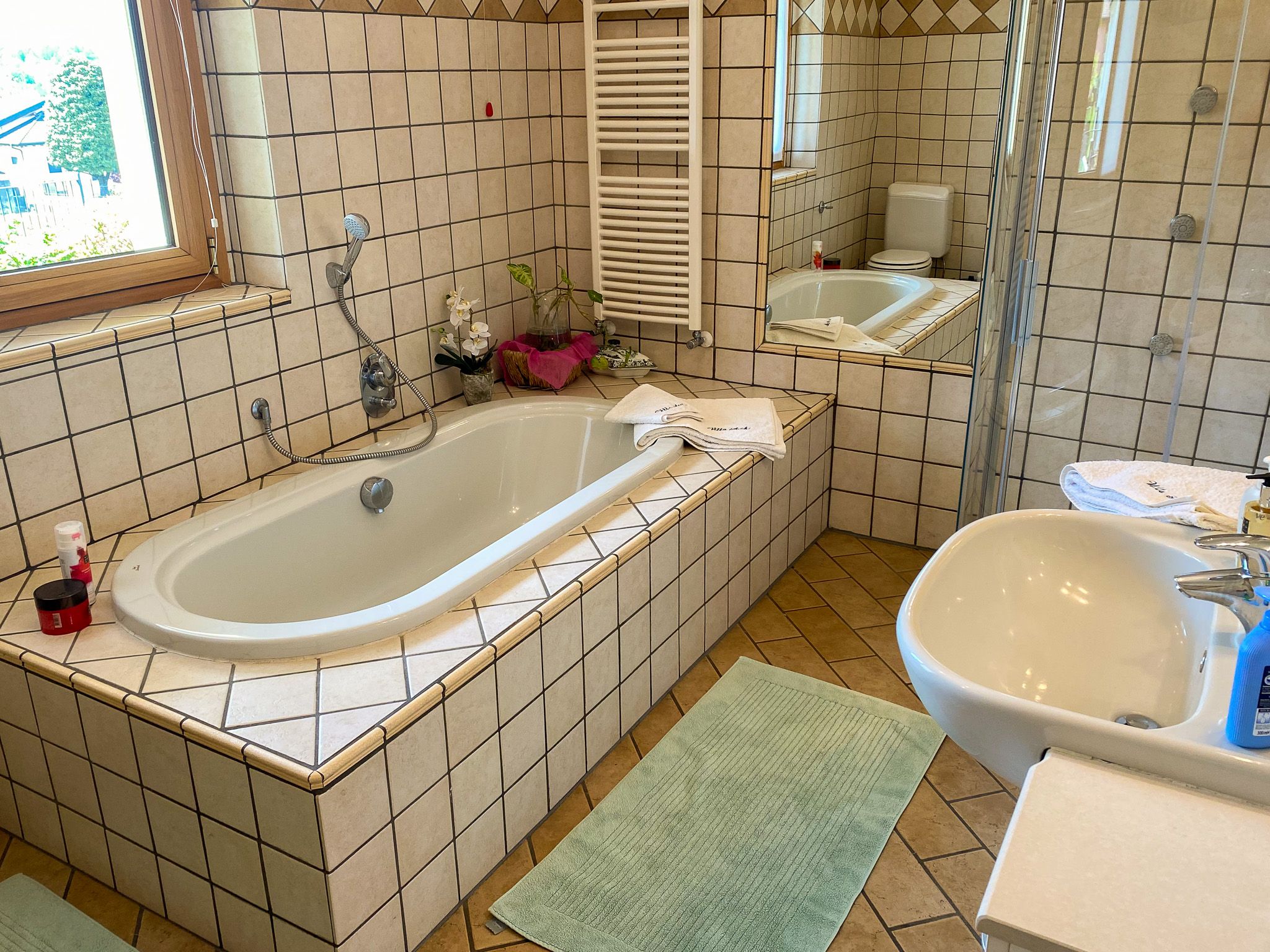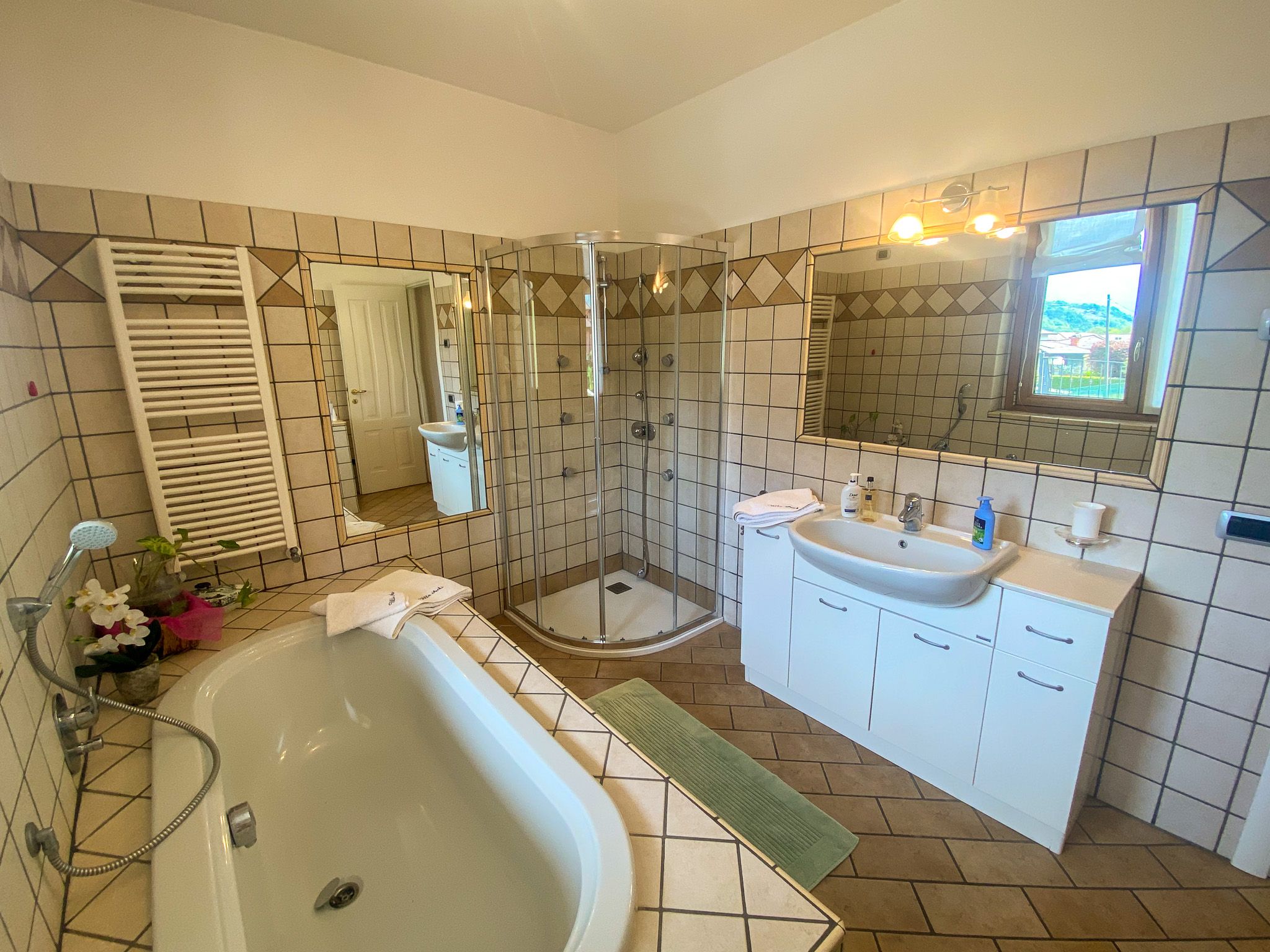 Una suite matrimoniale con bagno con doccia, angolo cottura e zona giorno, terrazza, una camera matrimoniale e una camera doppia con bagno in comune, ampio e luminoso con doccia circolare (sistema multigetto) e vasca.